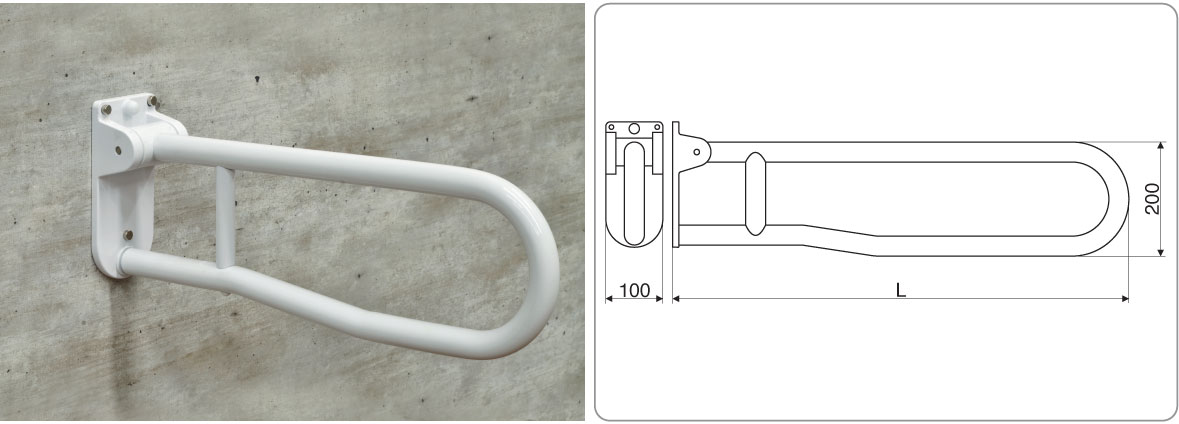 Tipo: Barra rebatible de seguridad para ser montada en diferentes tipos de muros. Su mecanismo permite posicionar la barra en posición vertical permitiendo una libre circulación del usuario según el caso.