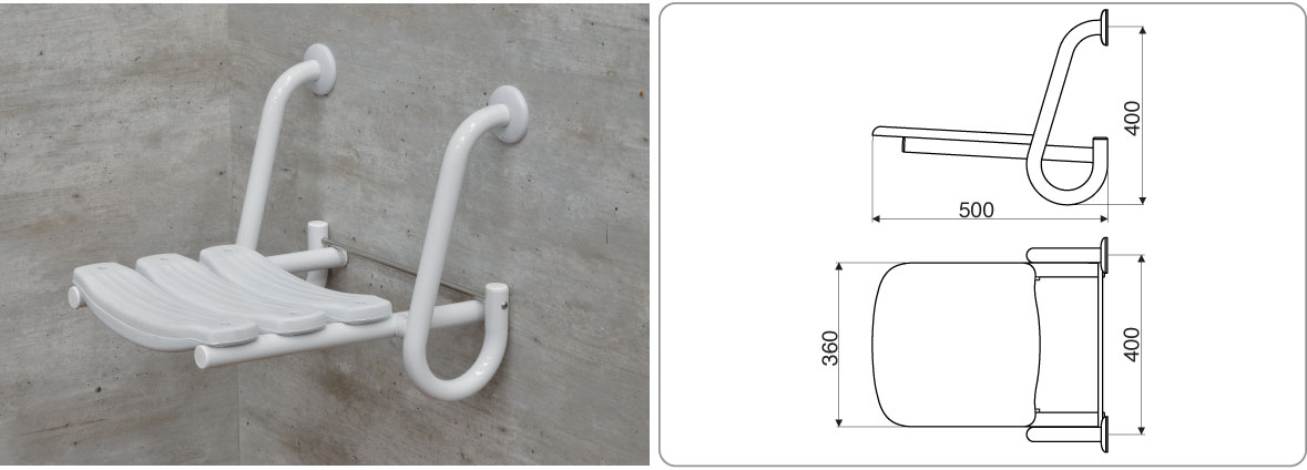 Tipo: Silla Rebatible de seguridad para ser montada en diferentes tipos de muros. Su mecanismo permite estar en posición vertical para ahorrar espacio, permitiendo una libre circulación del usuario según el caso.