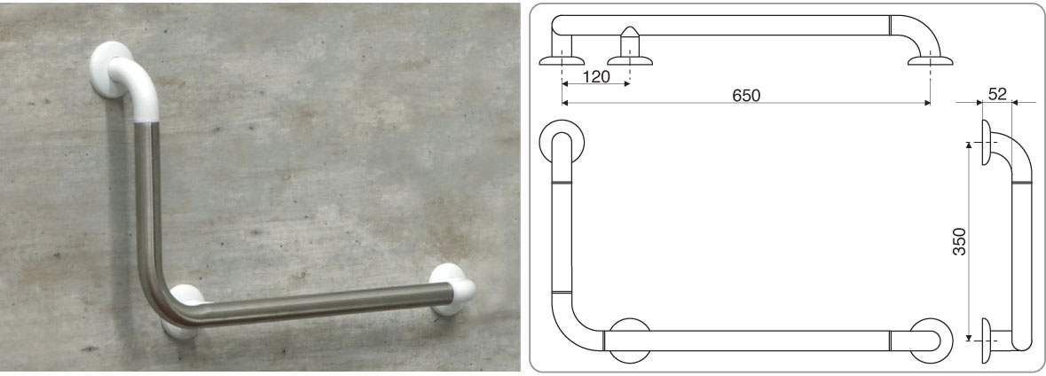 Tipo: Barra fija recta en «L» de seguridad para ser montada en diferentes tipos de muros. Su morfología permite soportar esfuerzos verticales como horizontales.
