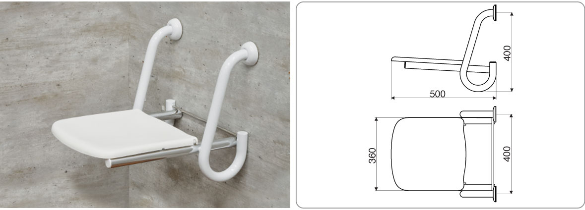 Tipo: Silla Rebatible de seguridad para ser montada en diferentes tipos de muros. Su mecanismo permite estar en posición vertical para ahorrar espacio, permitiendo una libre circulación del usuario según el caso.